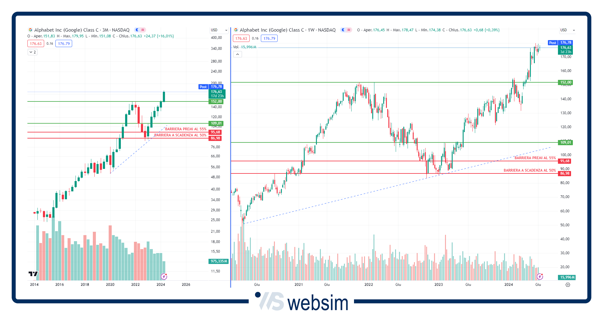Non si arresta la cavalcata rialzista di Google che punta dritto verso nuovi massimi storici, peraltro già aggiornati più volte nelle ultime settimane. Le maggiori aree di supporto per i prezzi si trovano prima a quota 150$ e poi più in basso verso i 109$. Entrambi questi livelli si trovano al di sopra delle due barriere, con quella per l'ottenimento dei premi che si trova a 95$, mentre quella a scadenza è posizionata a 86$ ad azione, con quest'ultima distante oltre il 50% dai prezzi attuali.