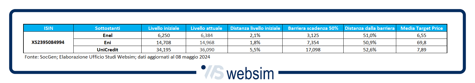 Ora che abbiamo visto perché è azzeccata la scelta dei titoli, non ci rimane che andare ad analizzare nel dettaglio i diversi punti di forza e le caratteristiche della new entry di Societe Generale (SG), ISIN XS2395084994. Si tratta di uno strumento che si caratterizza, oltre che per la scelta dei titoli sottostanti, per il suo connubio tra rischio e rendimento. In tal senso, il rischio è minimizzato dalla presenza di barriere profonde al 50%, su livelli dunque che considerando i titoli scelti per il basket danno una certa tranquillità. Su UniCredit la barriera al 50% è posizionata a quota 17,10 euro, livelli che il titolo non vede da aprile del 2023.