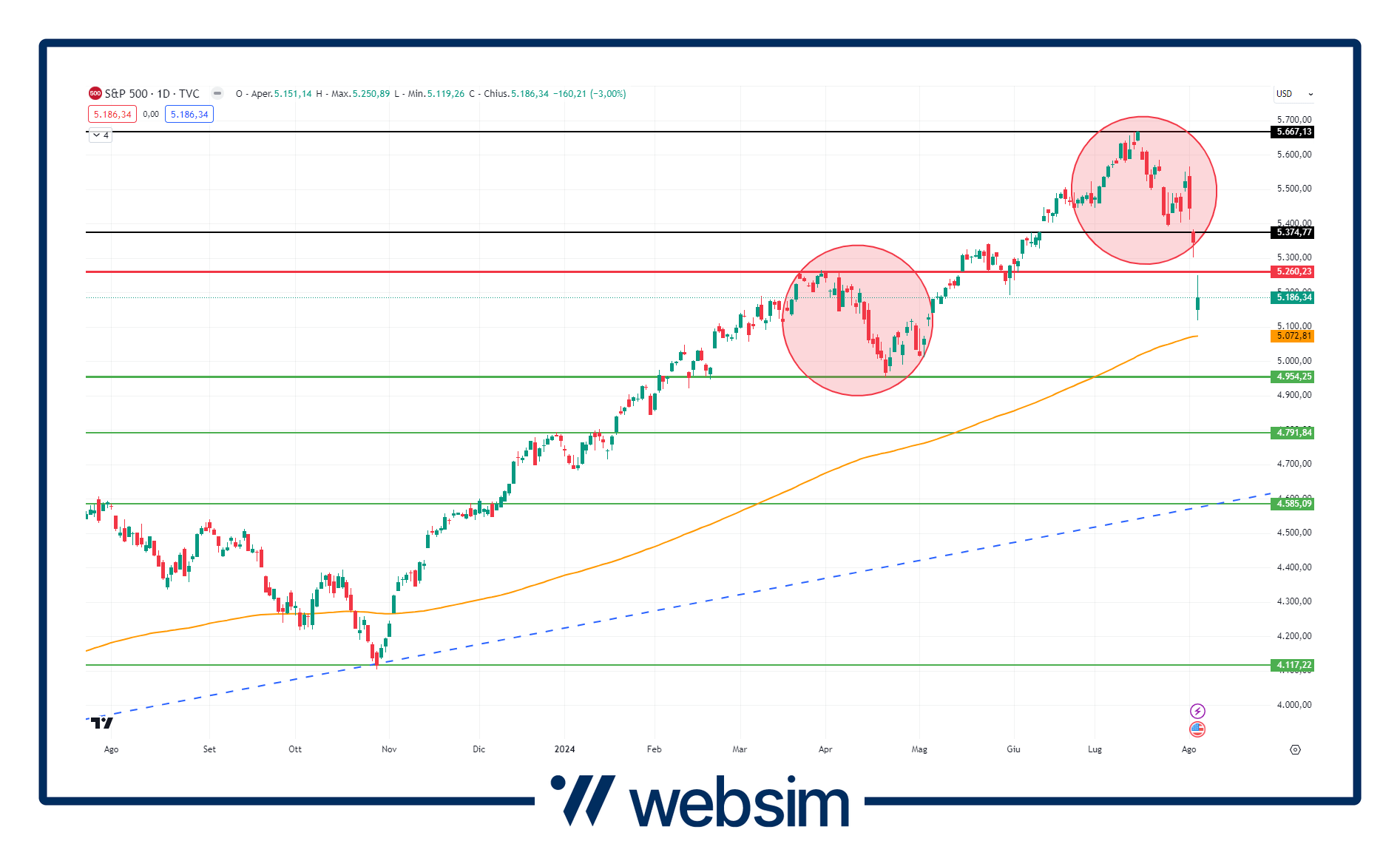Fase di debolezza per l'indice S&P 500 che con il gap down di ieri (-3%) ha compiuto il breakout dell'area supportiva a 5.260-5.300 punti. Questo dopo il rosso della seduta di venerdì 02 agosto, giorno in cui l'indice delle maggiori società americane non riuscì a tenere l'area di supporto a 5.370-5.400 punti.