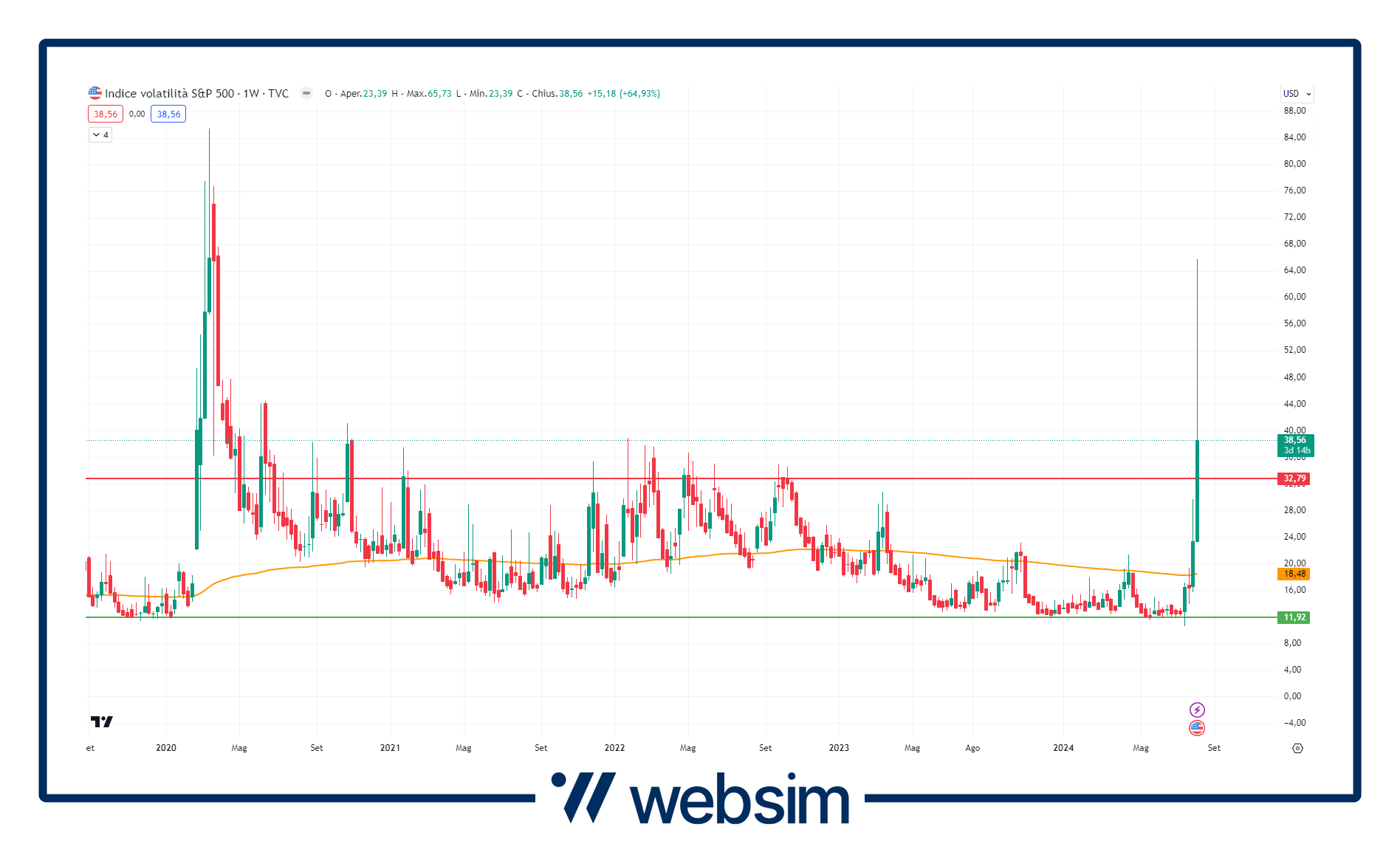 Un contesto di mercato in tensione come quello attuale non poteva non mostrare i suoi effetti anche sull'indice Vix, il cosiddetto "indice della paura" che, con il vertiginoso aumento della volatilità, nella seduta di ieri è balzato di oltre 65 punti prima di assestarsi con un progresso di oltre 15 punti (+64% rispetto la chiusura di venerdì). In particolare, il Vix si è riportato sui livelli più alti dal 2020 e ciò è evidente dal grafico qui sotto che mostra l'andamento del Vix su time frame settimanale.