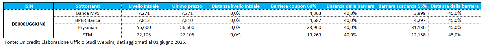 Con il certificato ISIN DE000UG6XJN0 si punta su quattro società con buoni fondamentali per strappare un rendimento oggettivamente molto elevato, senza essere del tutto direzionali con il mercato italiano. Il prodotto infatti paga premi mensili del 1,6% con memoria e condizionati ad una barriera al 60% (annuo del 19,2%), non un rendimento semplice da ottenere con i certificati d’investimento e per questo bisogna sicuramente fare i complimenti a UniCredit. Ricordiamo che la barriera al 60% copre fino a cali del 40% dai livelli attuali e, per questi quattro titoli, ci sembra comunque sensata. Le banche, infatti, come vedremo, godono ancora del bene placido dei mercati. Prysmian è leader indiscussa a livello mondiale nel suo settore ed ha un futuro assolutamente roseo, lo storno dovuto alle politiche di Trump non intacca la qualità del titolo. STM sembra gradualmente uscire dal tunnel e barriere al 55% implicano un ritorno sotto i minimi del covid, dunque molto difensive. La memoria in ogni caso permette di recuperare eventuali premi persi. Dunque, se anche ad una determinata data di valutazione il worst of dovesse essere sotto barriera, basterà che in una qualsiasi data di osservazione mensile successiva (fino a scadenza inclusa) i quattro titoli siano sopra la barriera. In tal caso il certificato pagherà la cedola del periodo, più tutte le cedole non pagate.