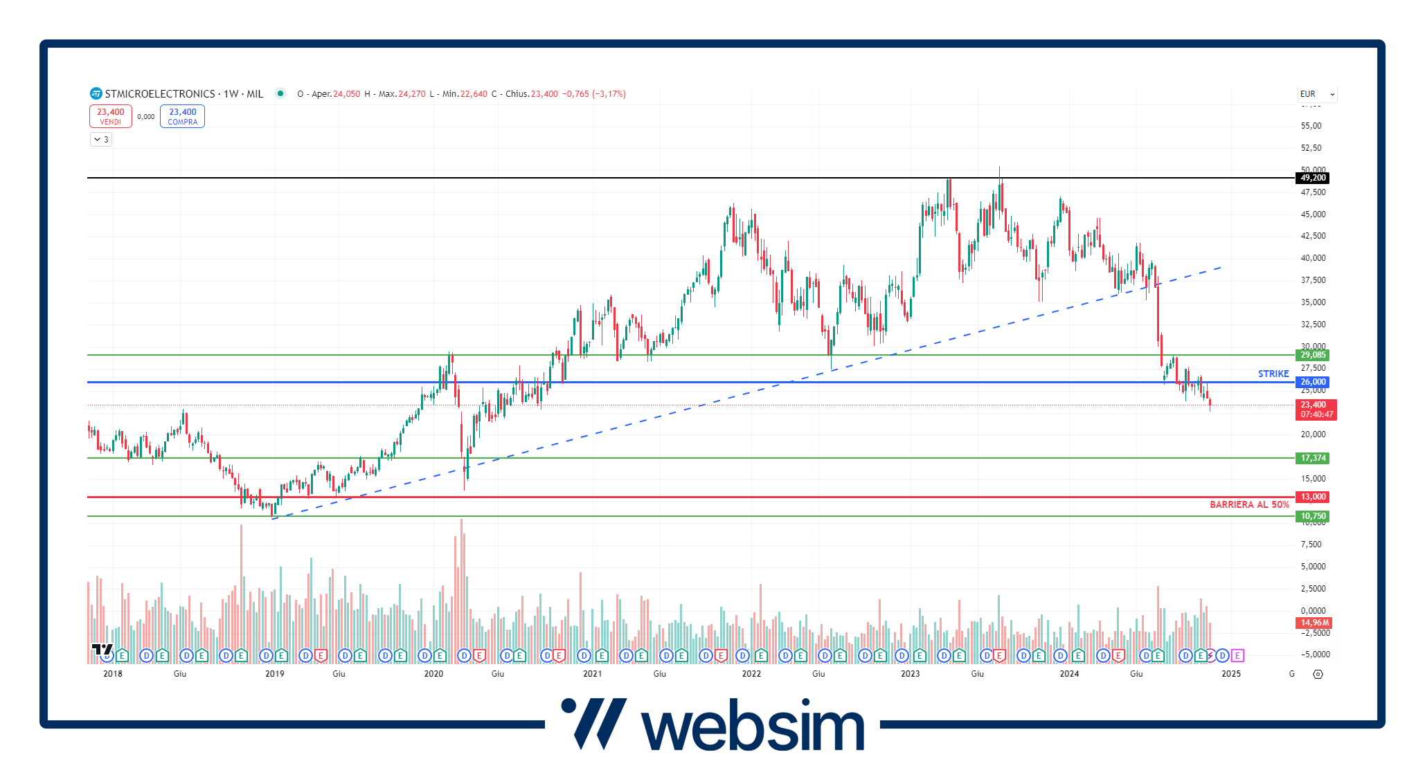 Merita più attenzione invece l'ultimo titolo del certificato di oggi, STM. Come vediamo dal grafico settimanale qui sotto, STM dopo aver raggiunto i suoi massimi di periodo a luglio 2023 ha invertito la direzione, perdendo da lì circa il -53%. In ogni caso, il certificato ha fissato il suo prezzo iniziale dopo gli ultimi ritracciamenti visti sul titolo e così la barriera di protezione al 50% si trova a 13 €, livelli del 2019.