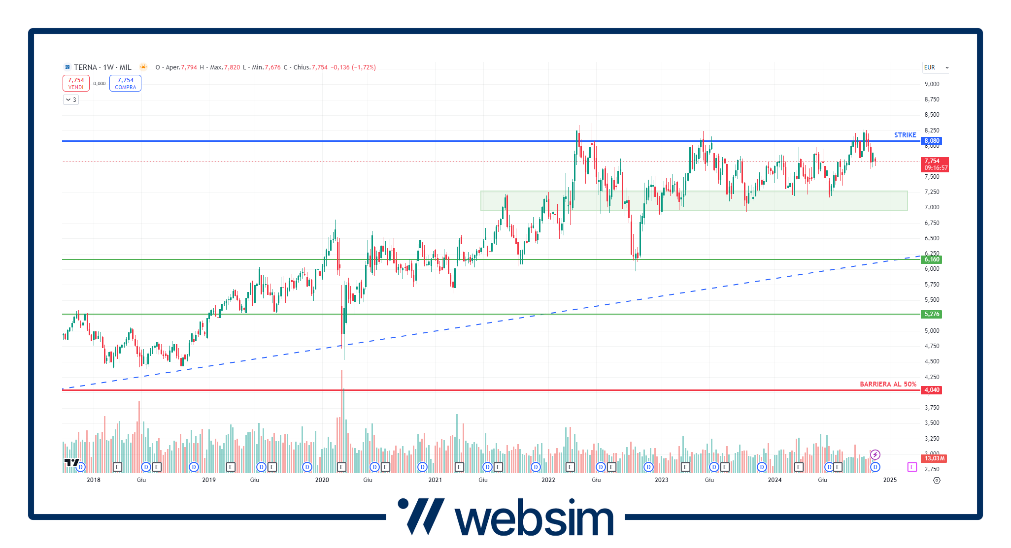 Ottimo prezzo Strike anche per il leader nel settore energetico italiano, Terna, che nel certificato ISIN XS2876286688 ha prezzo iniziale pari a 8 €, un livello vicino ai suoi massimi. Ciò permette di fissare il posizionamento della sua barriera di protezione a quota 4 euro, un livello mai più raggiunto da novembre 2016. I principali supporti per il titolo sono prima a 6 € e poi verso i 5,3-5 €.