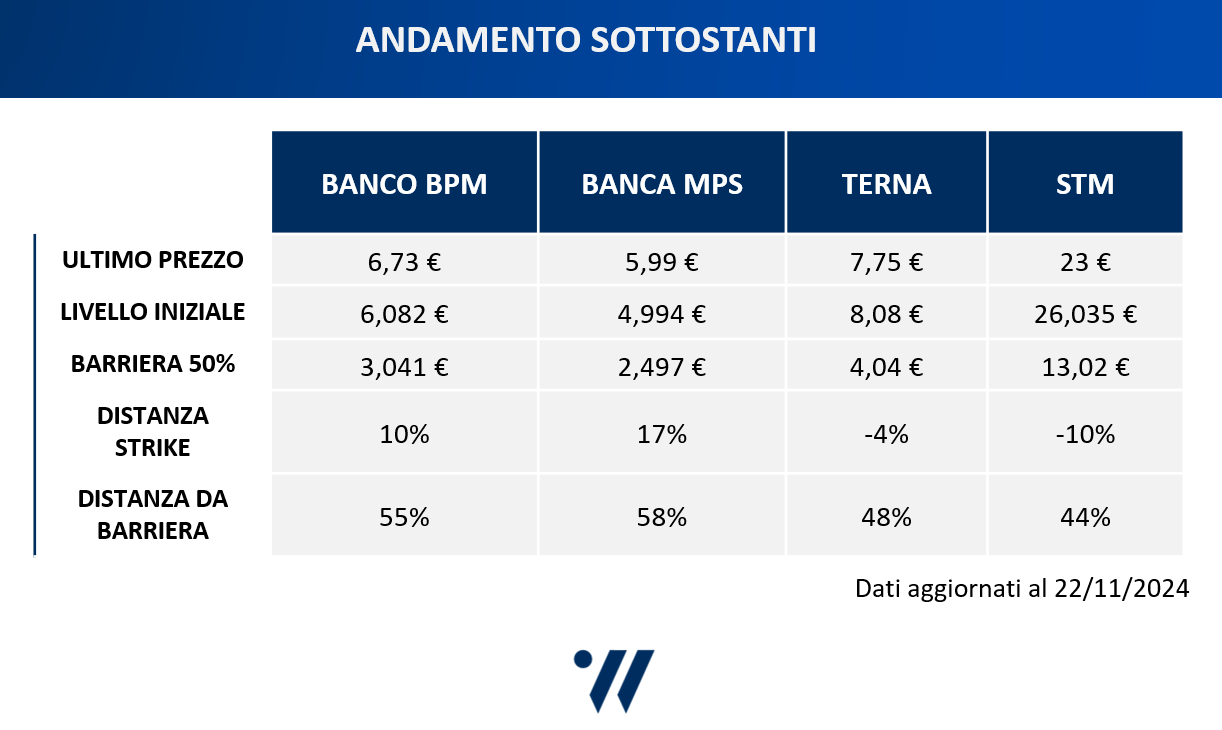 Il prodotto è stato emesso da Barclays sul mercato EuroTLX di Borsa Italiana lo scorso 25 ottobre e punta sul basket worst of composto da quattro titoli simbolo del mercato italiano: Terna, STM, Banco BPM e Banca MPS. Ma non solo, perché dopo la cedola iniziale e fino a scadenza (3 anni), prevede altri 35 premi mensili con memoria per arrivare al 4% annuo potenziale.