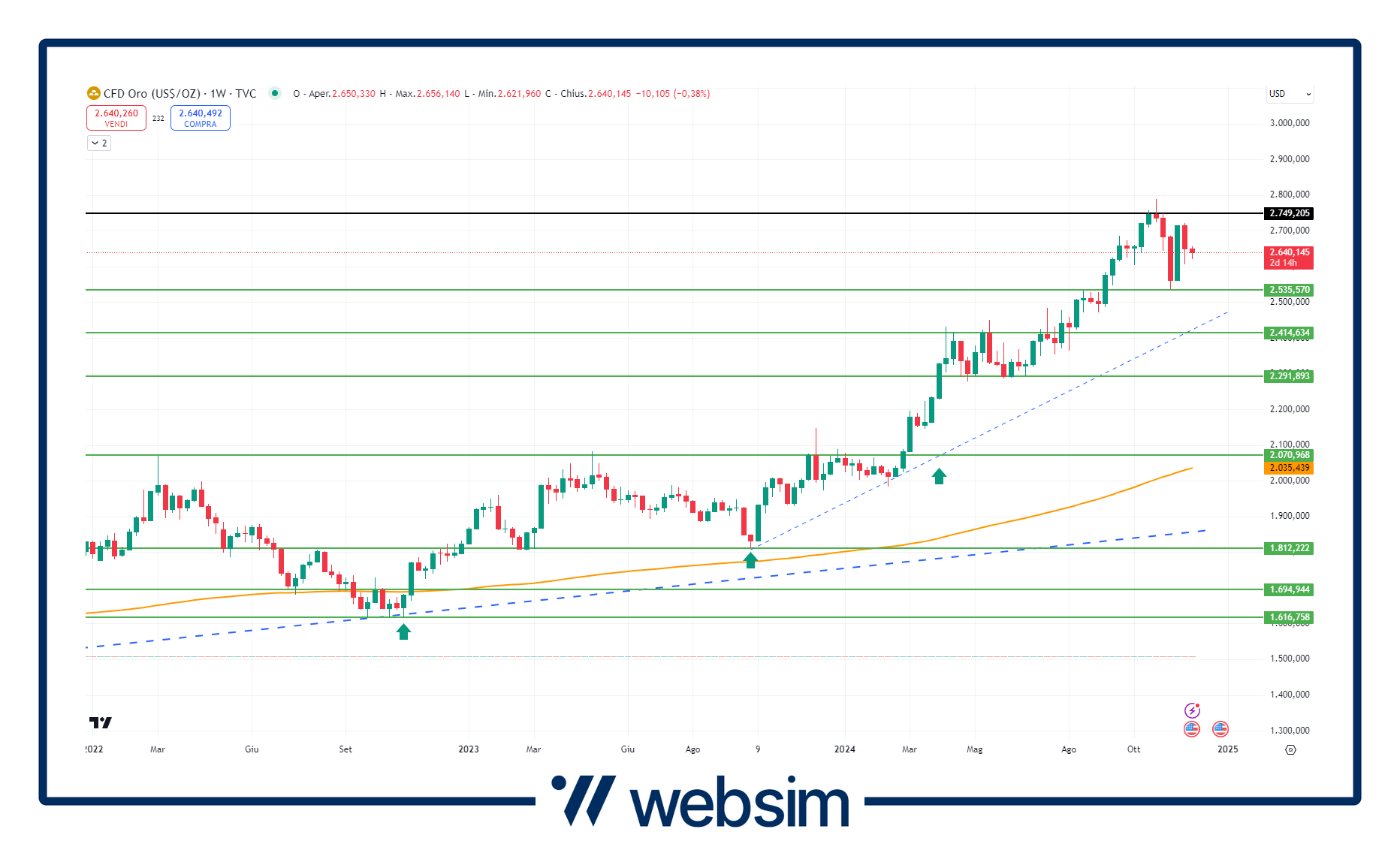 Fase di stallo per l'oro che, come vediamo dal grafico su time frame settimanale (qui sotto), da inizio novembre sta consolidando il trading range compreso tra l'area supportiva a 2.500 $ e la resistenza statica molto vicina al record storico a 2.750 $.
