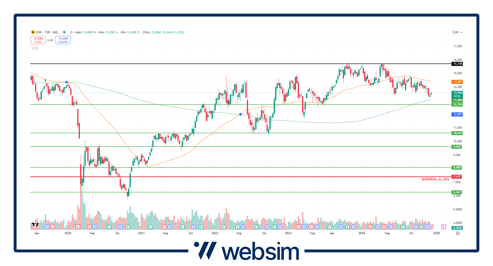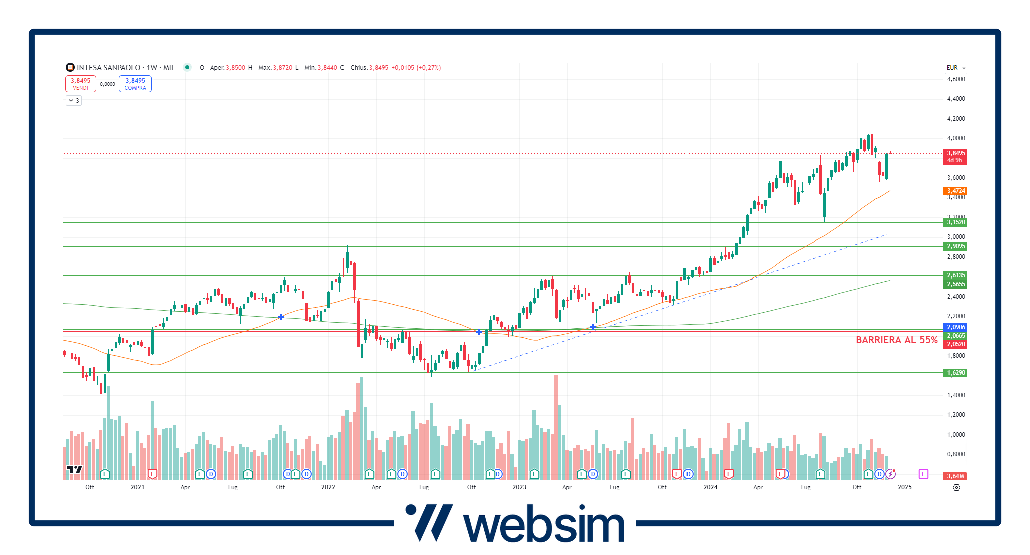UniCredit ha fissato il suo prezzo strike a 37,565 euro con la barriera di protezione al 55% che è dunque situata a quota a 20,66 euro, prezzi di settembre 2023. I principali supporti statici per UniCredit sono a 35 € - 30 € e 25 €.