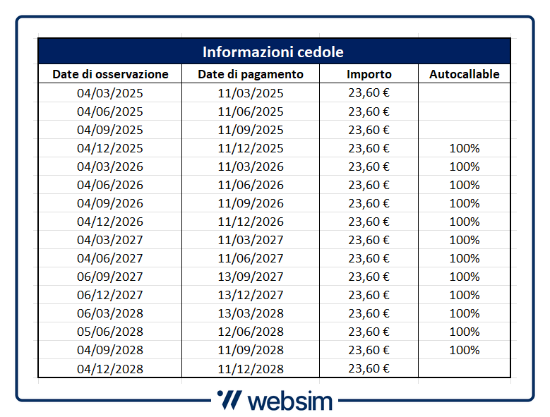 I premi è importante ricordare che sono provvisti del cosiddetto "effetto memoria", una proprietà del payoff che permette all'investitore di recuperare tutte le cedole eventualmente non percepiti in precedenza, se tornerà ad essere soddisfatta la condizione per il pagamento: tutti i tre sottostanti del basket sopra il livello barriera. Il vantaggio? Basterà che all'ultima data di osservazione di dicembre 2028, tutti i titoli saranno osservati con un prezzo sopra la barriera al 55%, per incassare tutte le 16 cedole previste dal prodotto. Visto il valore nominale di 1.000 euro, ogni premio trimestrale vale 23,6 euro, arrivando così ad un flusso cedolare complessivo è di 377,6 euro.