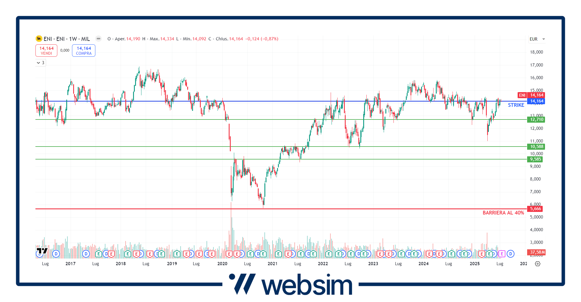 Appare molto ben posizionata la barriera al 40% su Eni per il certificato (ISIN XS3068020547). Infatti, Eni ha fissato il suo prezzo strike a 14,164 euro con la sua barriera di protezione che va dunque a cadere a 5,66 euro, su livelli di prezzo che nella storia recente del titolo ha sfiorato solo nel 2020 con la pandemia Covid.