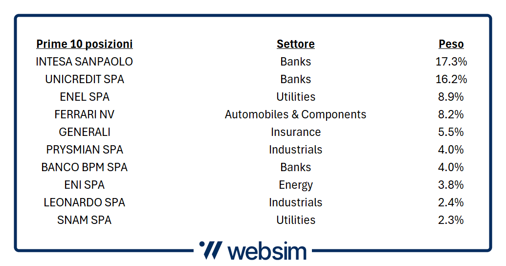 Nella tabella qui sotto vediamo i dieci titoli che hanno un maggior peso all'interno dell'AMC Italia Top Selection: