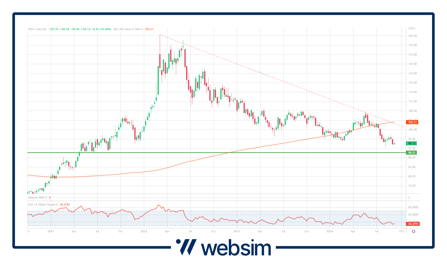 Dopo il rally rialzista messo a segno da inizio 2022, il Bloomberg Commodity Index ha invertito la direzione inserendosi in un trend ribassista. Tuttavia, da luglio dello scorso anno l'indice ha rallentato la sua discesa incanalandosi in una fase di consolidamento laterale tra 94$ e 108$. In caso di ulteriori ribassi sarà da monitorare la tenuta della principale area supportiva in area 90$.