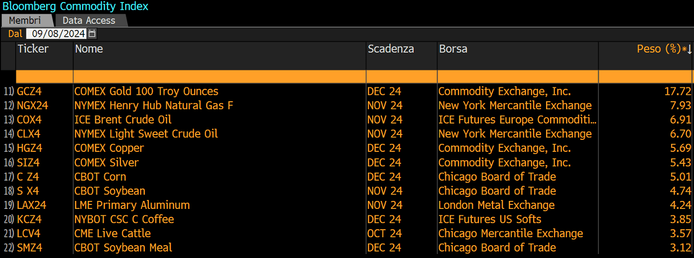 Nella tabella qui sotto possiamo vedere le commodity che ad oggi hanno maggior peso all'interno del Bloomberg Commodity Index, con l'oro che mantiene un peso rilevante di oltre il 17%. L'altro comparto influente del paniere è quello dei beni energetici, Gas 8% e Petrolio 14%.
