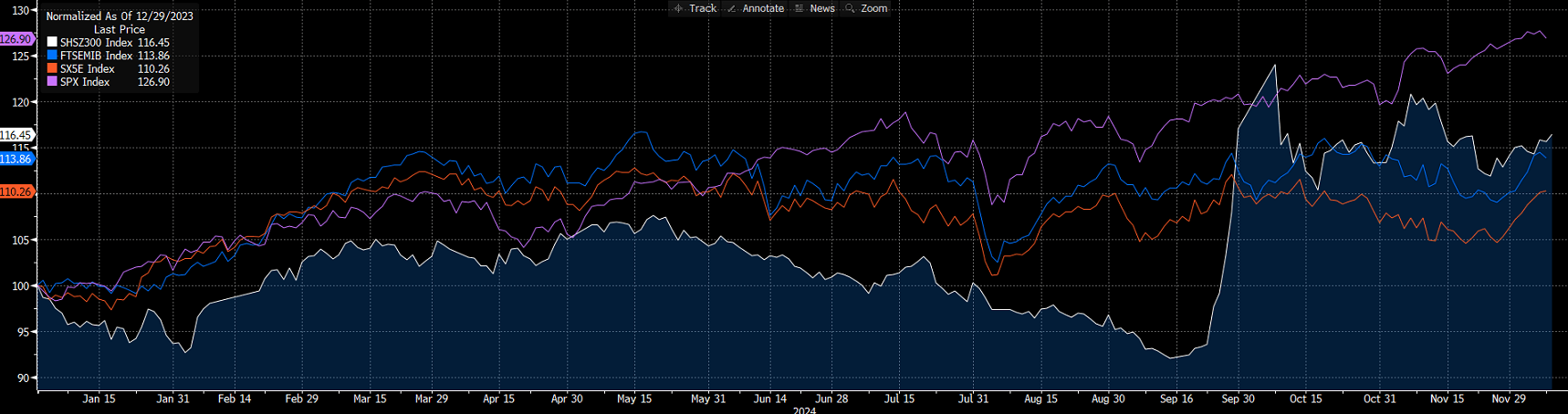 Un mix di notizie che rendono più appetibile un mercato complesso. La Cina, infatti, è terra di opportunità per gli investitori, ma presenta anche forte volatilità, rimanendo un mercato per profili con maggiore esperienza sui mercati finanziari. Quest’anno si chiude comunque con un bilancio positivo. Il CSI 300, il vero protagonista di queste manovre (anche dichiarato dalle autorità cinesi come vedremo), ha realizzato una performance circa del 16%, contro un 14% del Ftse Mib, un 11% dell’Euro Stoxx 50 e un 27% dell’S&P 500.