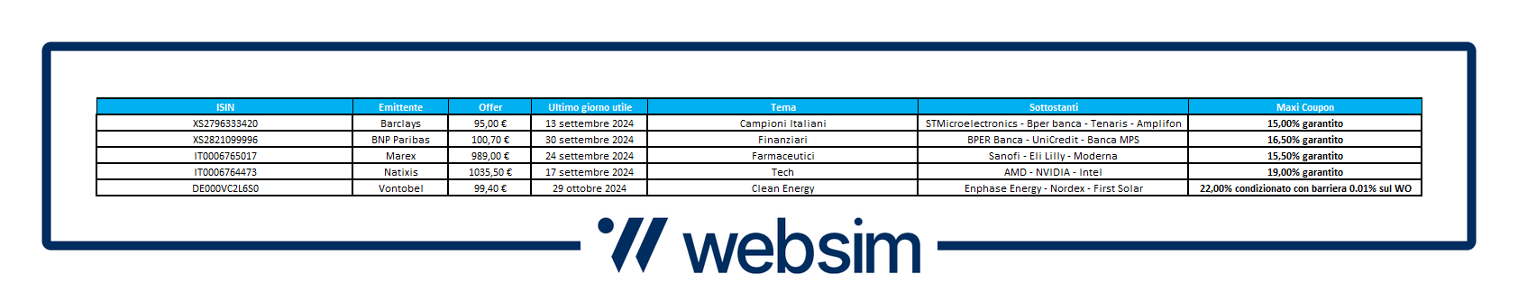 Ricordiamo, prima dell’adesione, di leggere attentamente il prospetto di base, ogni eventuale supplemento, la nota di sintesi, le condizioni definitive e il documento contenente le informazioni chiave (KID) e, in particolare, le sezioni dedicate ai fattori di rischio connessi all’investimento, ai costi e al trattamento fiscale relativi ai prodotti finanziari ivi menzionati reperibili sul sito dell’emittente.
