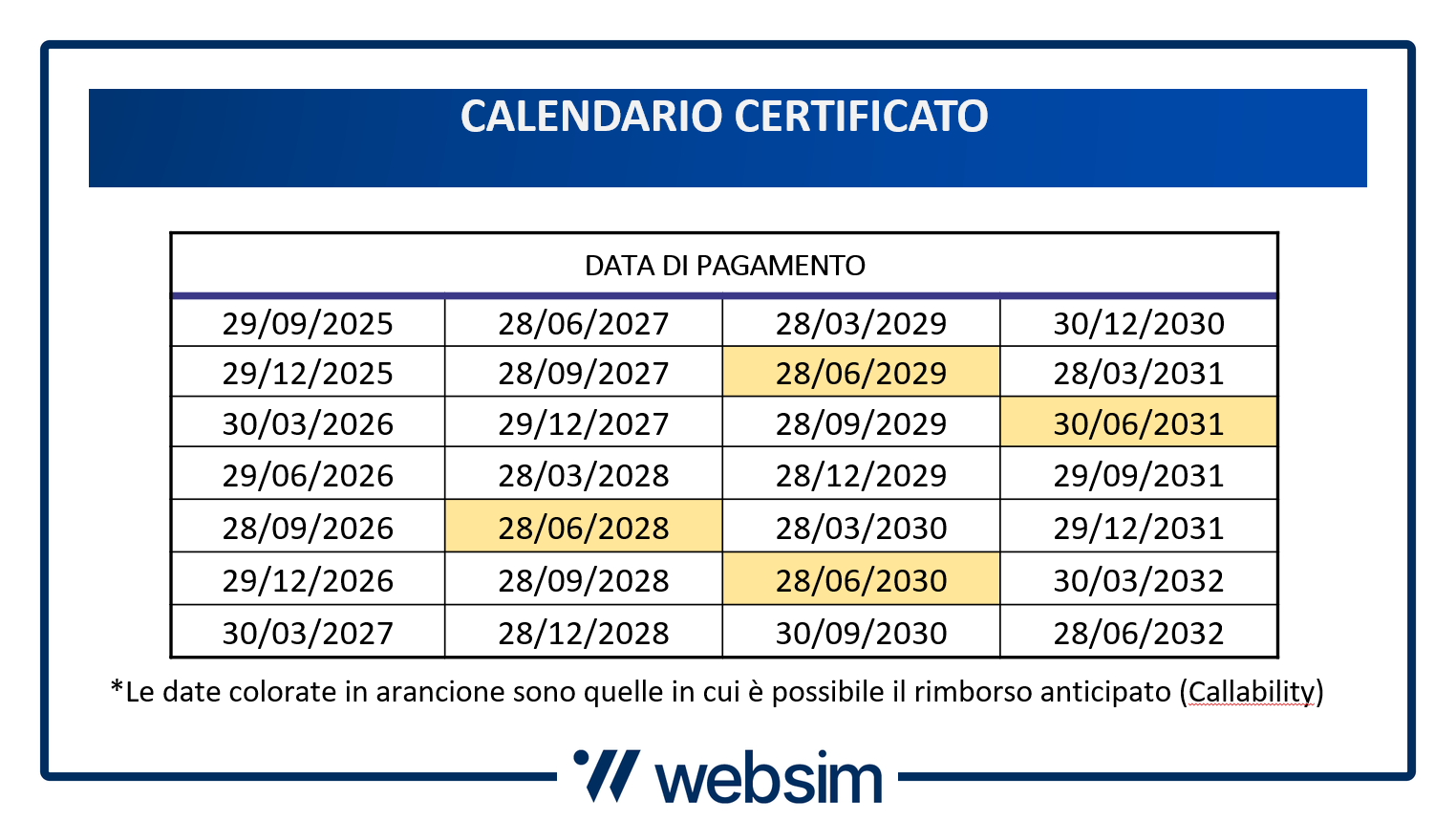 La durata è sette anni ma il prodotto può essere richiamato a discrezione dell’emittente (callable) dal 28/06/2028, con cadenza annua. In tal caso verrebbe pagato l’ultimo premio e rimborsato il 100% del nominale. La struttura permette dunque di bloccare un rendimento interessante per almeno tre anni.