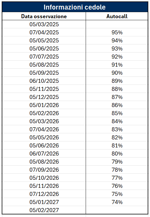 La peculiarità del prodotto, come dicevamo, è nell’autocall che è prevista già dal secondo mese, prima data di osservazione 7 aprile 2025, con trigger del 95%. Questo significa che, affinché ci sia il rimborso anticipato, basterà che nessuno dei quattro titoli abbia perso alla data di osservazione più del 5%. In tal caso, il prodotto paga 100 euro a certificato più l’ultima cedola, più eventuali cedole non pagate. Il trigger per il rimborso anticipato poi andrà a decrescere del 1% mensile fino al 74% (step down), facilitando l’autocall.