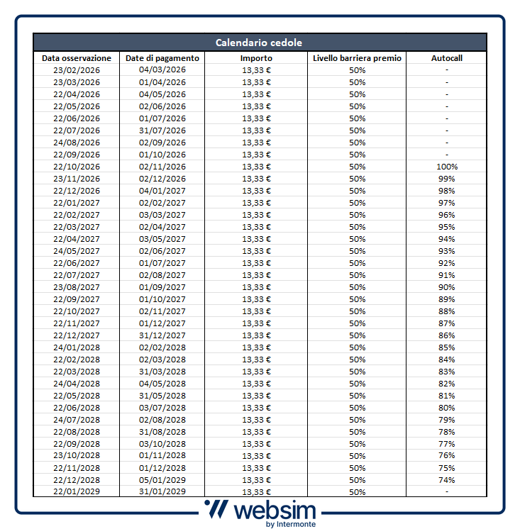 Come per il primo certificato, tutti i premi godono dell'effetto memoria e il meccanismo di Autocall è attivo da ottobre 2026 con trigger decrescente dall'1% mensile, partendo dal 100% fino al 74%.