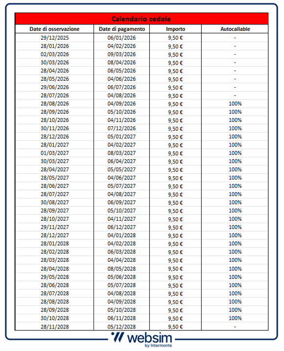 Il certificato (ISIN XS2878527386) è stato emesso sul mercato secondario di Borsa Italiana il 1° dicembre 2025 e, come vediamo dalla tabella qui sotto, la prima cedola sarà pagata il 6 gennaio (con data di osservazione al 29 dicembre).