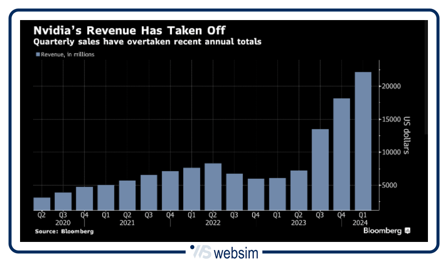 Nvidia ha archiviato i primi tre mesi del 2024 con un utile netto pari a $14,8 miliardi (+628% rispetto un anno fa, +21% rispetto i tre mesi precedenti), o di $5,98 per azione, cifre impressionanti se teniamo in considerazione che nel medesimo periodo dello scorso anno si era attestato a $2,04 miliardi, o 82 centesimi per azione. Stessa tendenza anche per i ricavi che volano di oltre il 260% su base annua a quota 26 miliardi di dollari, in rialzo del 262% rispetto allo scorso anno e del +18% rispetto ai tre mesi precedenti, battendo di molto anche in questo caso le stime del consensus ferme a poco più di 24 miliardi di dollari. Nel grafico di Bloomberg, qui sotto, possiamo vedere l'incredibile trend dei ricavi di Nvidia dalla seconda metà del 2020, dove è visibile chiaramente l'impennata dei ricavi dalla seconda metà del 2023.