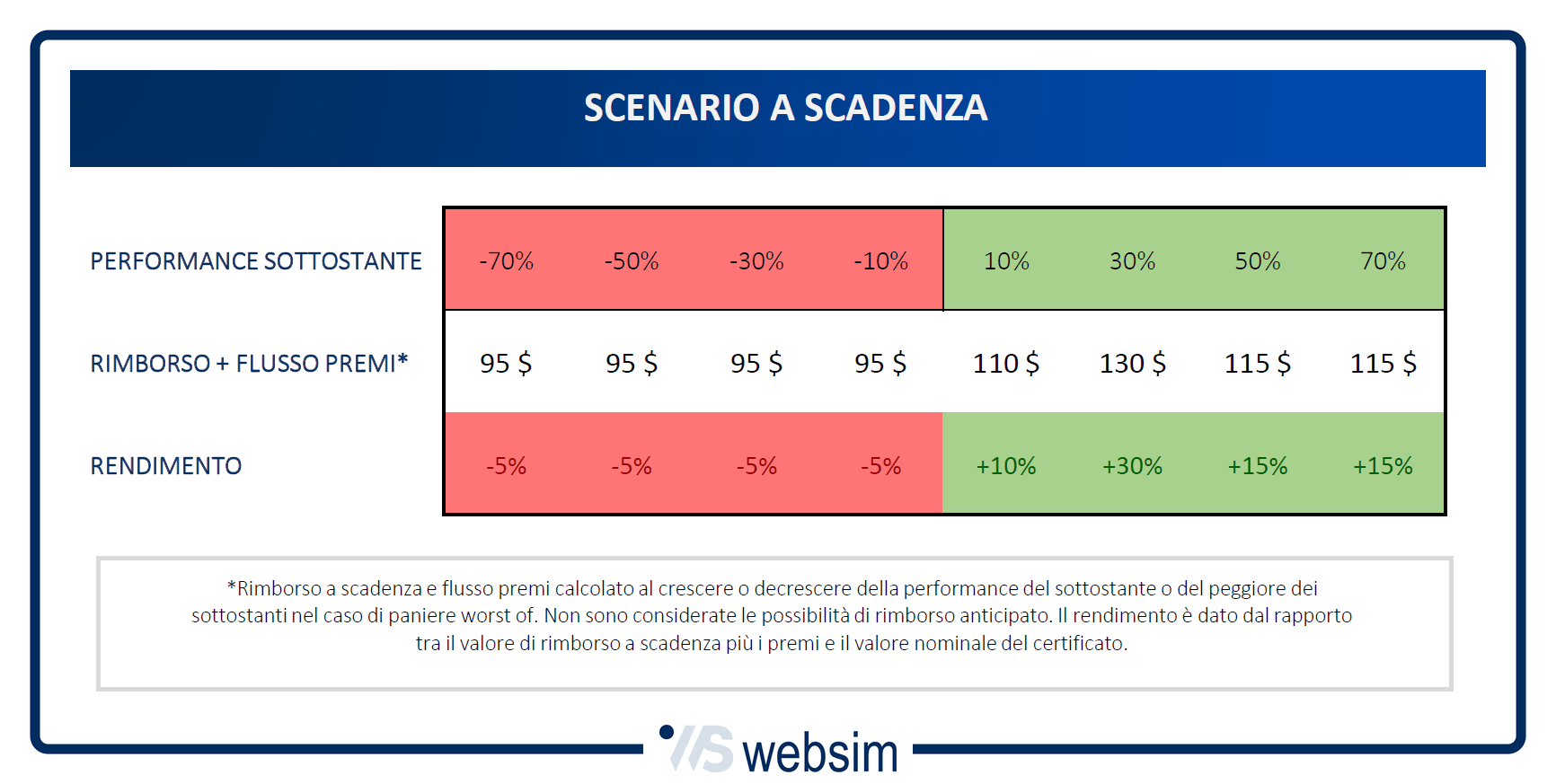 - Se Nvidia si apprezza di un valore pari o superiore al 50%, il certificato rimborsa il valore nominale ed un premio fisso del 20%, con il rimborso che sarà quindi di 115 dollari visto lo strike al 95%.