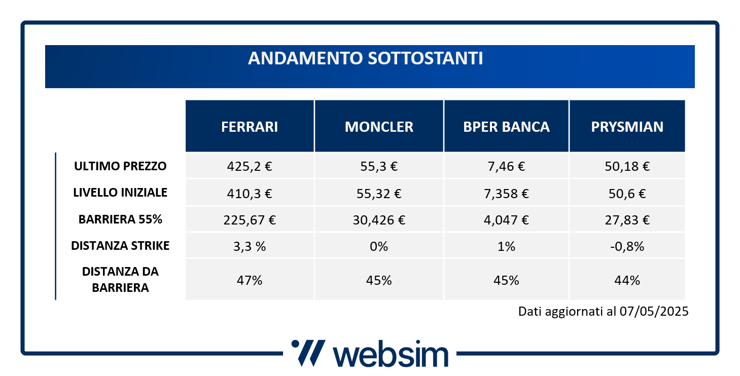 In questo scenario così frammentato e difficile da interpretare, cresce l'interesse per soluzioni d'investimento capaci di offrire maggiore resilienza e protezione. Ed è qui che si inserisce perfettamente la nuova proposta di Natixis che il 5 maggio ha emesso su Borsa Italiana un nuovo certificato Airbag Cash Collect (ISIN IT0006768797), uno strumento pensato per affrontare proprio i contesti di mercato più turbolenti. Questo perché oltre a puntare su ottimi sottostanti e ad avere barriere di protezione ampie, la sua struttura vanta il meccanismo di protezione aggiuntiva dell'Airbag, meccanismo che come vedremo tra poco permette di ridurre le perdite in caso di breakout al ribasso della barriera a scadenza da uno o più titoli sottostanti, ovvero: Ferrari, Prysmian, BPER Banca e Moncler.