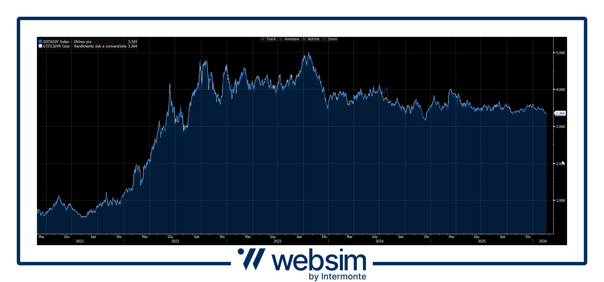 Quanto detto si traduce in tassi a lungo termine in calo e molto vicini al costo medio del nostro debito pari a circa il 3%. Questo, pertanto, consente al MEF di rifinanziare il debito anche su scadenze lunghe senza aumentarlo in modo significativo, migliorando così la sostenibilità del debito stesso e quindi anche la potenziale appetibilità agli occhi degli investitori. In prospettiva i tassi potrebbero permanere su livelli relativamente contenuti, in un contesto di crescita bassa e spinte inflattive molto contenute, a meno di eventi straordinari. Inoltre, anche in tema di Area Euro, per quanto riguarda la BCE, il mercato non prezza rialzi dei tassi nei mesi a venire visto il buon posizionamento della crescita, e soprattutto dell'inflazione, prevista raggiungere il benchmark del 2% nei prossimi anni.