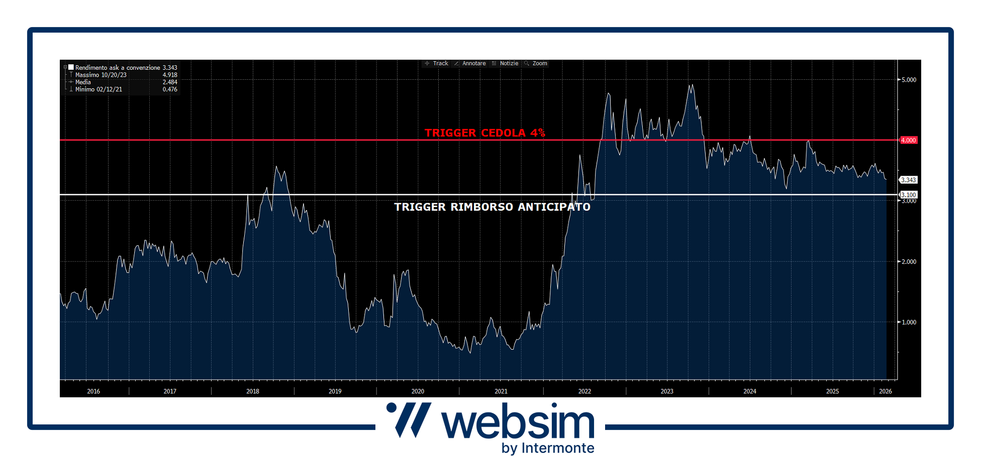 - Trigger cedola 4%: se, nelle date di osservazione semestrali, il sottostante sarà uguale o inferiore al 4%, il prodotto pagherà la cedola del 2,69% lordo. Grazie alla memoria sarà possibile, fino a scadenza inclusa, ottenere eventuali cedole non pagate;