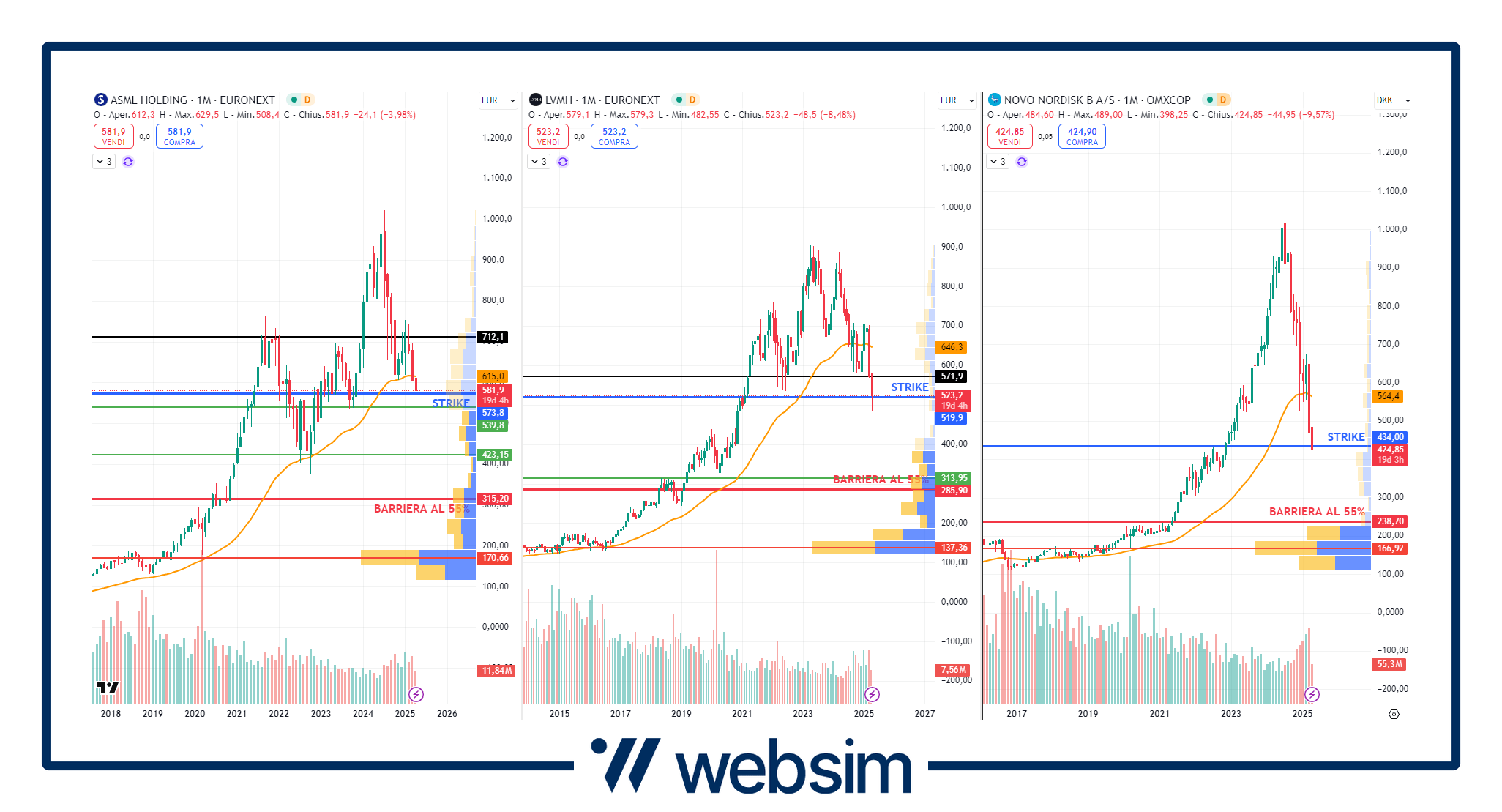 Per chi preferisce un’esposizione su nomi globali ad altissima capitalizzazione, ecco l'altro certificato di UniCredit con codice ISIN DE000UG4VNH3. Il basket worst-of in questo caso è composto da tre sottostanti e in particolare tre leader nei rispettivi settori: farmaceutico (Novo Nordisk), tecnologia (ASML) e lusso (LVMH). Tutti con fondamentali solidissimi e con gli outlook a lungo termine che rimangono positivi.