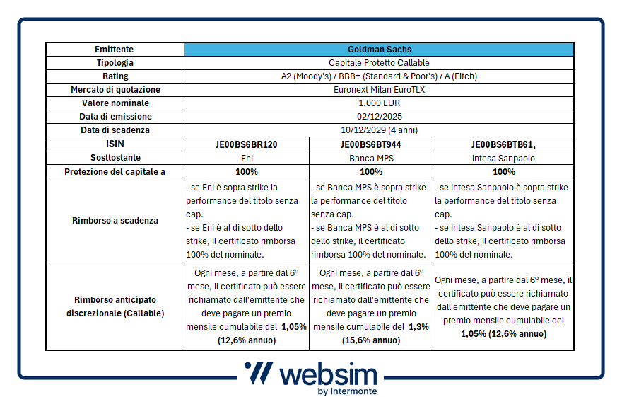 Goldman Sachs (rating alto standing: S&P’s BBB+ / Moody’s A2 / Fitch A) ha rinnovato la gamma di capitale protetto callable con tre nuovi certificati single stock su tre titoli italiani: il certificato ISIN JE00BS6BR120 che punta su Eni, quello ISIN JE00BS6BT944 su Banca MPS e il prodotto ISIN J00BS6BTB61 che investe su Intesa Sanpaolo. Tre titoli dagli ottimi fondamentali e tra i più amati dagli italiani. Tre soluzioni d’investimento che pur proteggendo al 100% a scadenza l’investitore (dicembre 2029), promettono di partecipare alla performance senza cap del sottostante se il prodotto non sarà richiamato dall’emittente durante la sua vita. Scenario che però prevede il pagamento, da parte della banca d’affari americana, di premi mensili cumulabili di importo elevato. Vediamo allora le caratteristiche del prodotto: