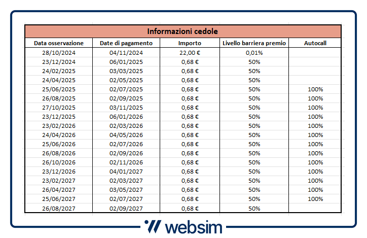 In ogni caso, ricordiamo che per ricevere il 4 novembre la ricca cedola iniziale, l'investitore dovrà aver acquistato il prodotto entro la Cum Date del 29 ottobre.