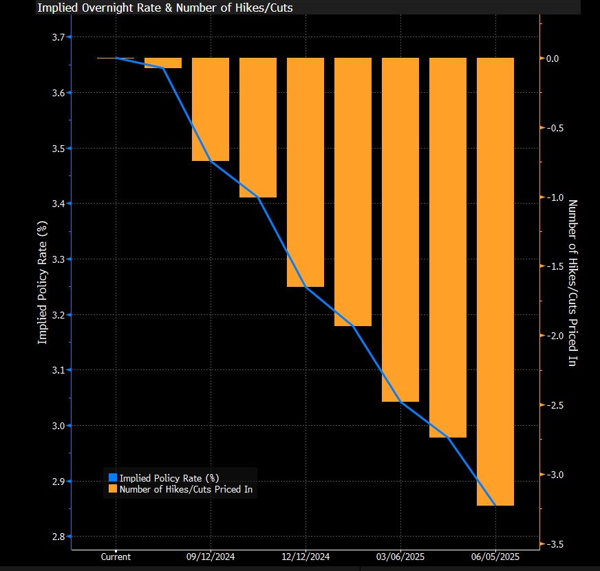 Quindi se si crede sulla prosecuzione del taglio dei tassi da parte della BCE, è logico credere in un calo anche del CMS 10y tale da portare il prodotto a pagare i premi e magari ad andare al rimborso anticipato nel giro dei primi due anni di vita del certificato. Quest’anno, lo ricordiamo, il mercato si aspetta altri circa due tagli da parte della BCE, mentre per l’anno prossimo, entro il 2025, dovremmo vederne altri due/tre e il tasso sui depositi scendere al 2,75%, dal 3,75% attuale.
