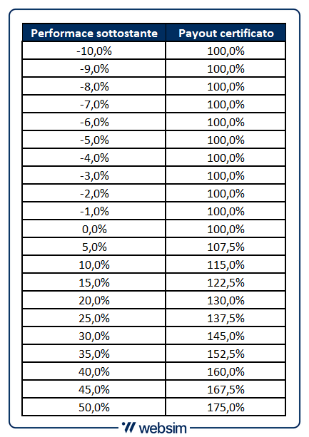 Qui di seguito una tabella riassuntiva dei possibili rimborsi a scadenza a seconda delle diverse performance dell’indice a scadenza in relazione allo strike iniziale: