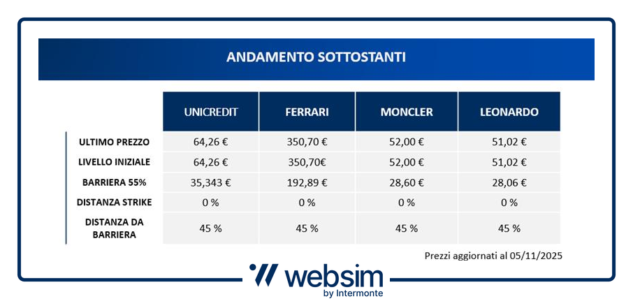 Sottostanti solidi e familiari per il pubblico italiano caratterizzano il nuovo certificato ISIN XS3167669517. Il paniere riunisce quattro protagonisti di primo piano dell’economia nazionale: UniCredit, colosso del settore bancario; Leonardo, leader nella difesa e nell’aerospazio; e due simboli dell’eccellenza del lusso italiano, Moncler e Ferrari. Un mix bilanciato che combina comparti ciclici e difensivi, espressione di settori strategici per il mercato europeo e capaci di offrire un buon equilibrio tra potenziale di rendimento e solidità dei fondamentali.