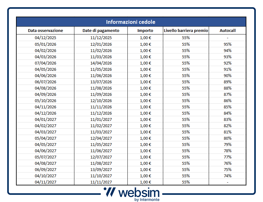 Il prodotto è stato emesso sul mercato secondario di Borsa Italiana il 4 novembre e la prima data in cui sarà monitorato il rispetto della barriera premi al 55% per stabilire o meno il pagamento della cedola è prevista per il 4 dicembre (in pagamento l'11 dicembre).
