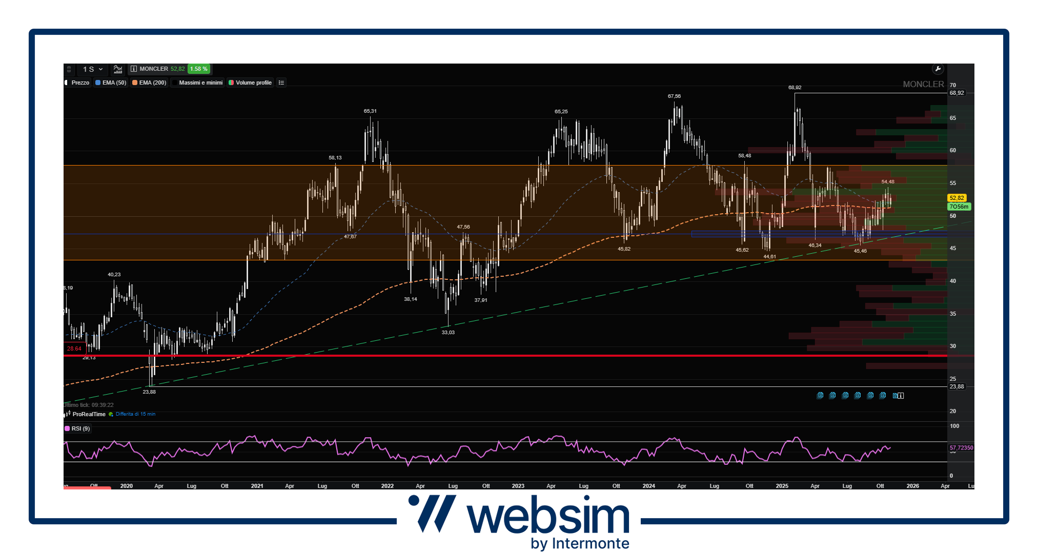 Situazione tecnica in via di miglioramento per Moncler che dai minimi di agosto mostra già un +14%, confermando così la tenuta e il rimbalzo dall'area supportiva dei 46 euro. Nei primi nove mesi dell'anno Moncler ha realizzato ricavi per 1,84 miliardi di euro, in leggera flessione dell'1% rispetto al medesimo periodo del 2024. Intanto, gli analisti di Barclays hanno alzato la raccomandazione su Moncler da equal-weight a overweight, con il target price che passa da 55 a 61 euro. La mossa è giustificata dal solido track record di Moncler nel quarto trimestre, che per la società è il quarter più importante dell'anno, tant'è vero che come nota Barclays, nel 2024 ha rappresentato circa il 42% dei ricavi.