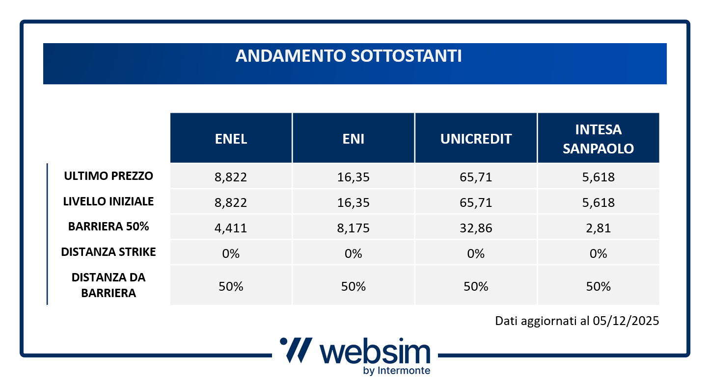 - Sottostanti: Enel - Eni - UniCredit - Intesa Sanpaolo