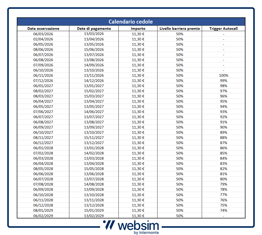 I prodotti pagano premi mensili con memoria, condizionati al rispetto di una barriera al 50% dei valori iniziali (strike) fissati alla chiusura del 13 febbraio. Questo significa che, a ogni data di osservazione mensile, se nessun titolo del basket worst of avrà perso più del 50% del valore iniziale, il certificato paga la cedola mensile. In caso contrario, la cedola non viene pagata ma rimane custodita in memoria, pronta a essere recuperata non appena la condizione di pagamento tornerà a essere soddisfatta.