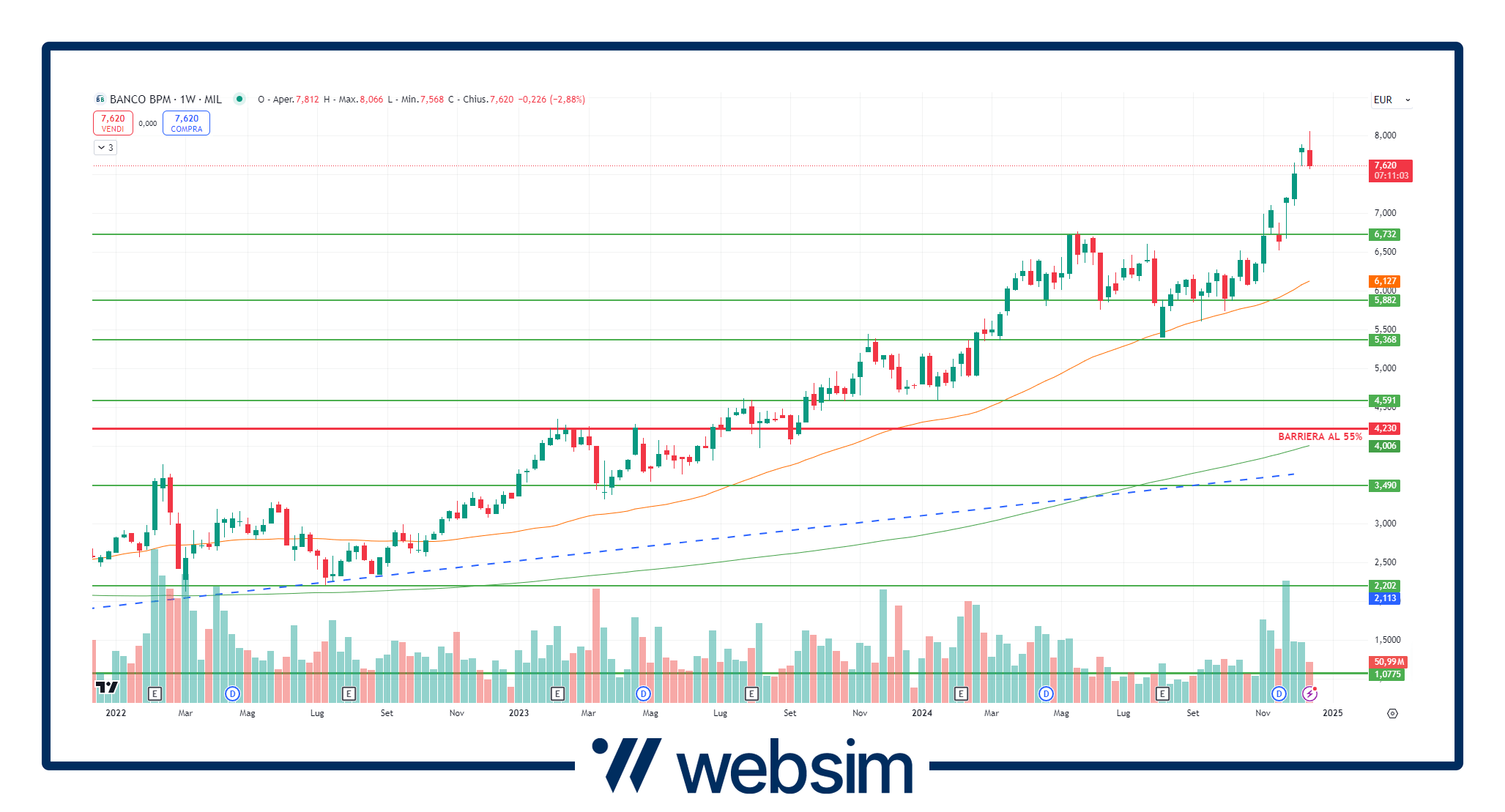 In virtù di questo meccanismo della struttura, per chiudere l’investimento in bellezza e portare a casa tutti i 36 premi previsti, basterà che i quattro sottostanti quotino sopra la barriera (o allo stesso livello) all’ultima data di osservazione, ovvero il 20 dicembre 2027. A quel punto l’investitore avrà portato a casa un flusso cedolare totale pari a 45 euro (valore nominale di 100 euro), con un rendimento dunque del 45% in tre anni, ovvero il 15% all'anno di rendimento. Per nulla male se consideriamo i fondamentali e l'impostazione grafica di tutti i quattro titoli del basket che ricordiamo essere: UniCredit, Banco BPM, Banca MPS e BPER Banca.