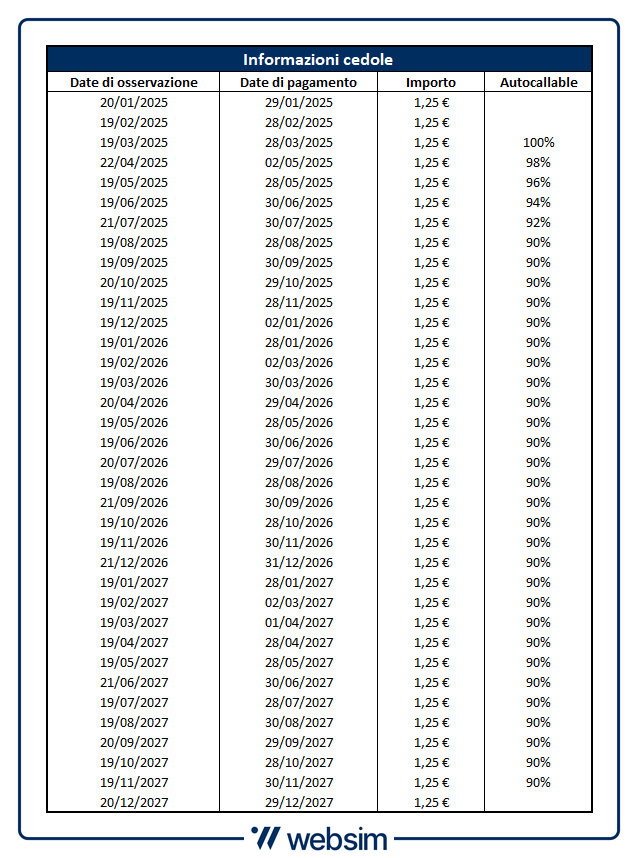 Nella tabella qui sotto possiamo vedere il calendario delle cedole e per il rimborso anticipato del certificato ISIN XS2919342266.