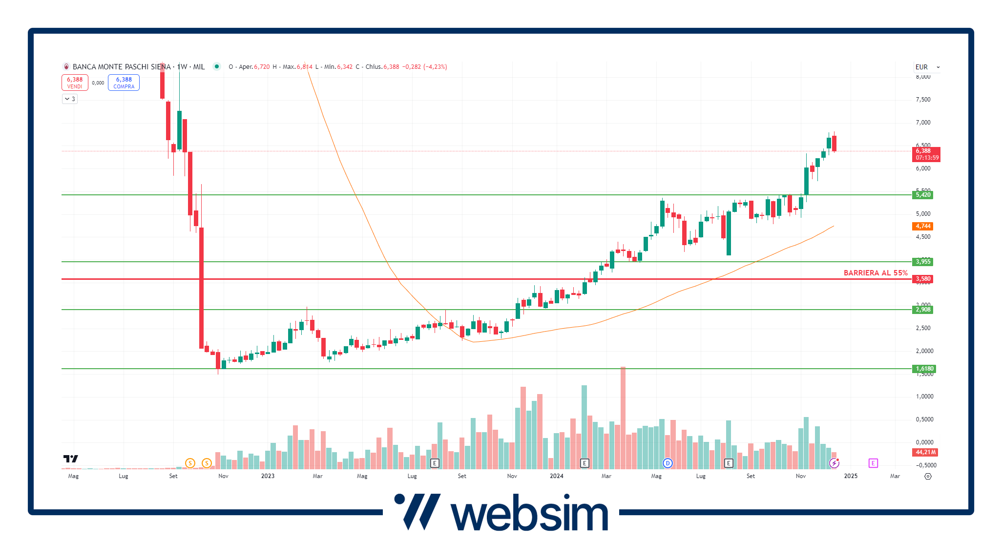 Su Banca Monte Paschi di Siena la sua barriera al 55% è posta a 3,58 euro visto che il suo prezzo di riferimento iniziale è 6,52 euro.