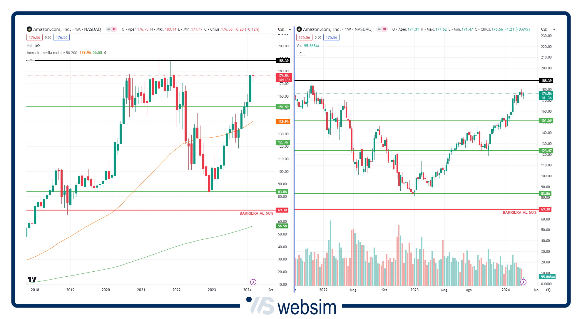 Qui sotto possiamo vedere l'andamento grafico degli altri due titoli del paniere e come vediamo sia Amazon che Alphabet si trovano molto distanti dalle rispettive barriere che risultano essere posizionate quindi su livelli strategici e al di sotto di importanti aree di supporto per i prezzi.