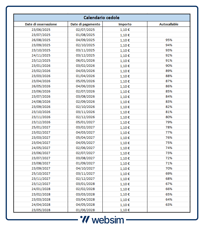 Nella tabella sotto trovate il calendario delle cedole e del rimborso anticipato previste dal certificato ISIN XS3035093726: