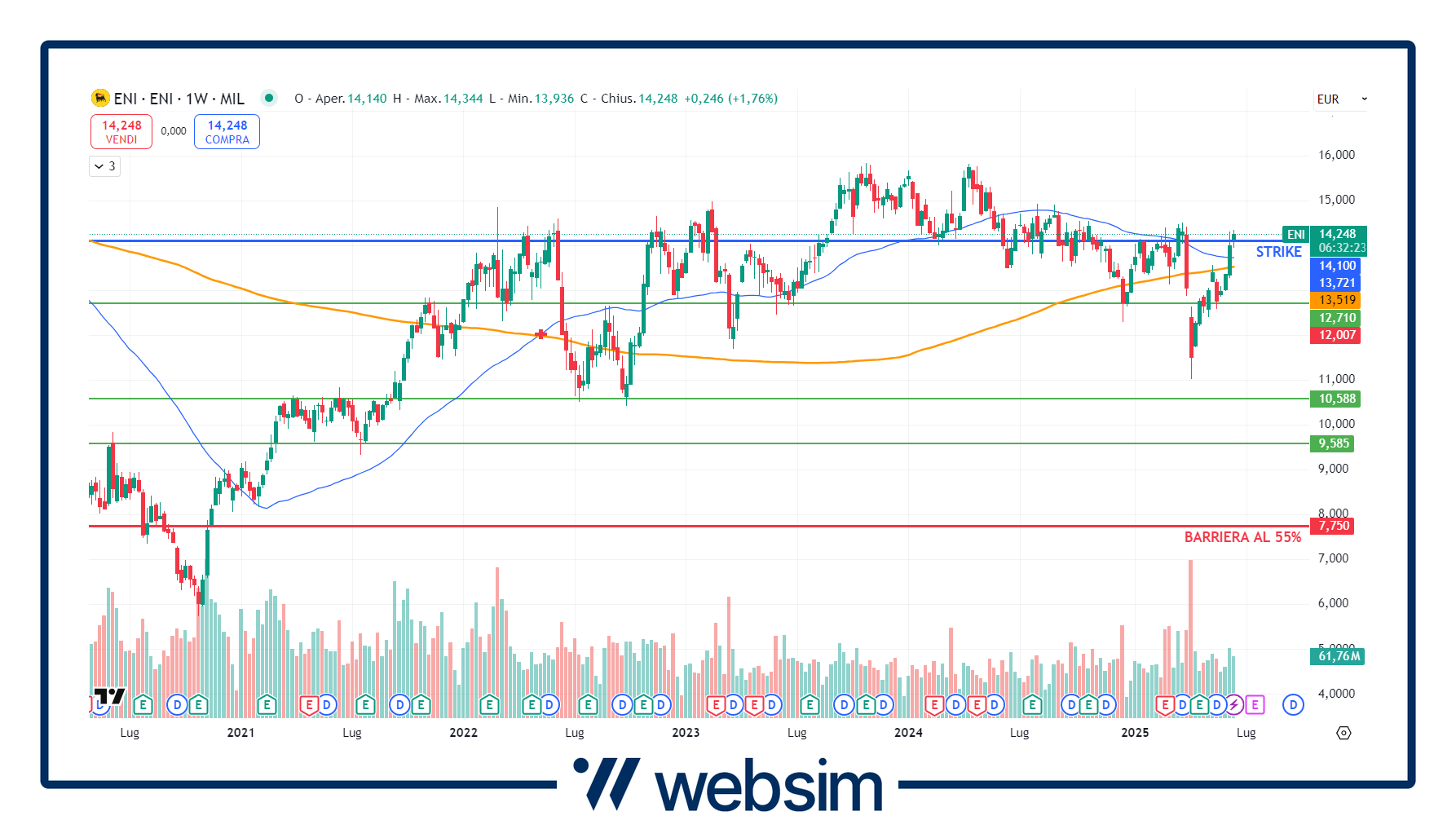 Eni ha fissato il suo prezzo iniziale (17 giugno) a 14,1 euro, con la barriera premi e scadenza che va dunque a posizionarsi a quota 7,75 euro, su livelli molto profondi per il titolo (prezzi di inizio 2021).
