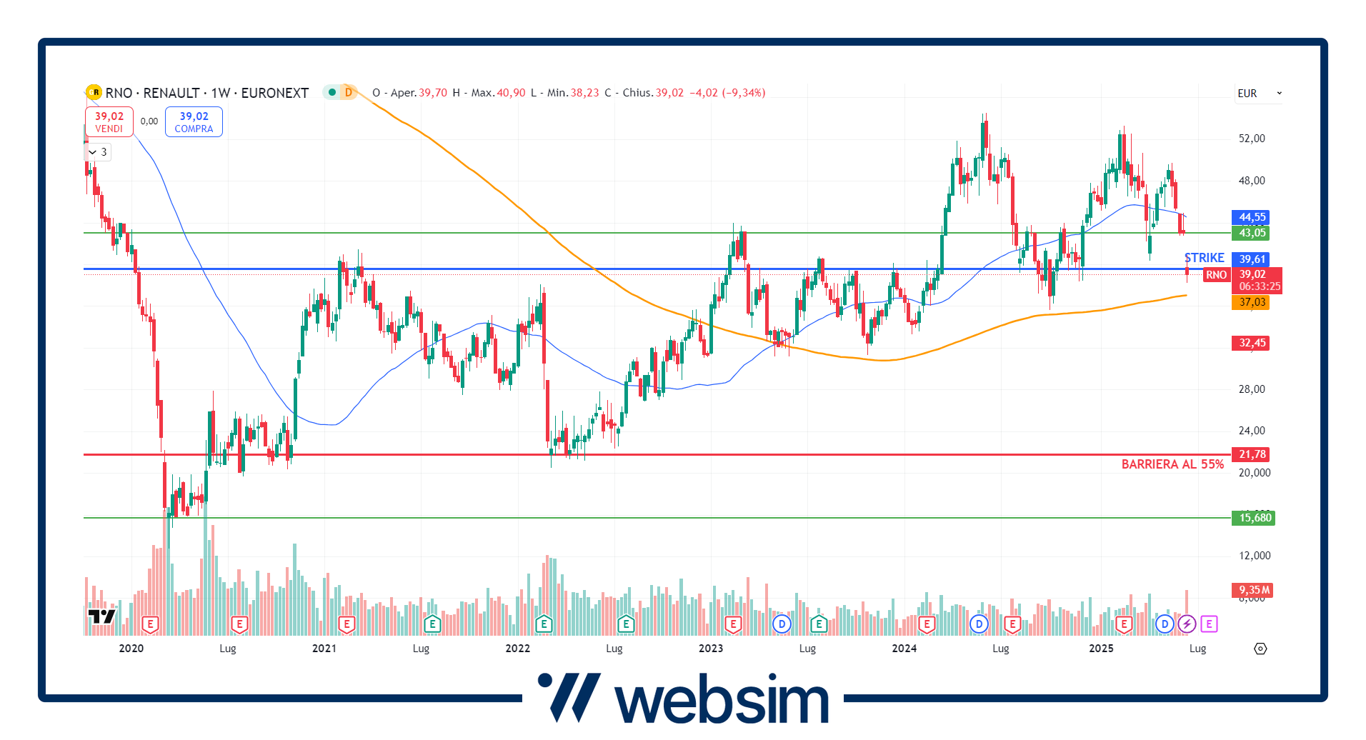 Come vediamo dal grafico settimanale rappresentato qui sotto, Renault ha fissato il suo prezzo strike (linea blu) a 39,6 euro, dopo la flessione innescata dall'uscita di De Meo dal management del gruppo. Ciò permette al certificato di avere una barriera al 55% sul titolo ancora più ampia in area 21 euro (linea rossa), in prossimità di un'importante zona supportiva per il titolo.