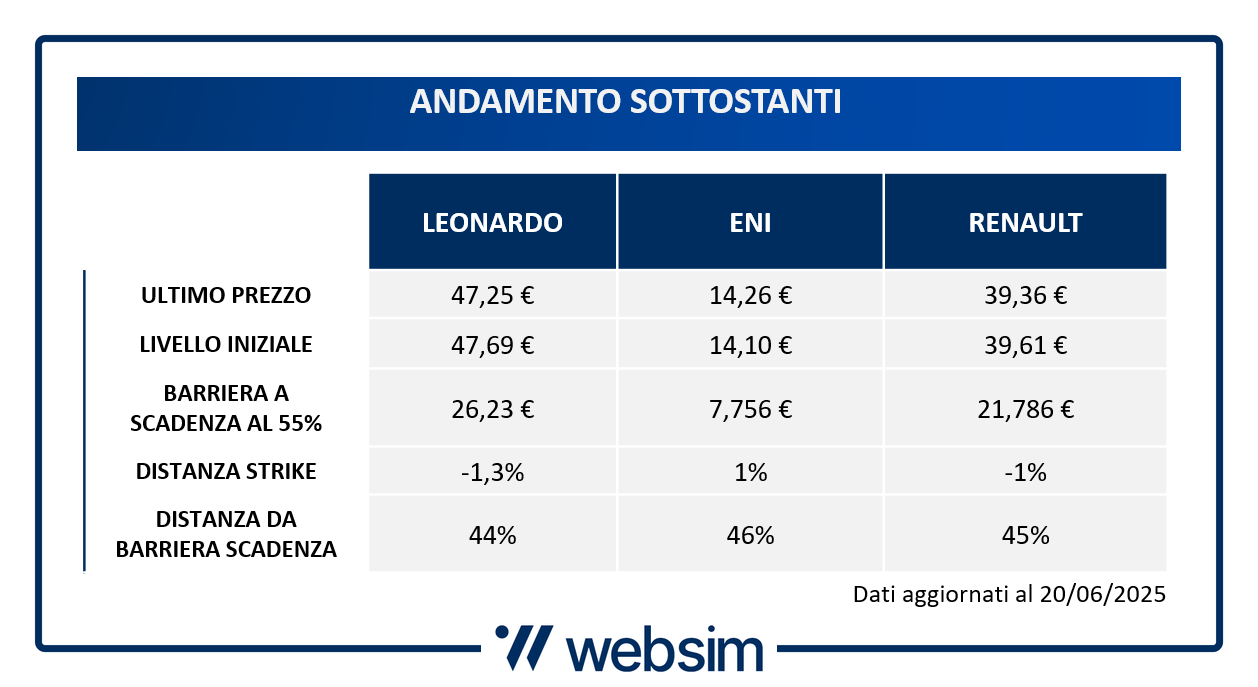 Il prodotto è stato emesso ieri 19 giugno e ha dunque fissato i suoi prezzi di riferimento iniziali il giorno dopo la flessione di Renault causata dall'uscita di de Meo dal management del gruppo. Al momento, però, il titolo peggiore del paniere è Leonardo che sta riprendendo fiato dopo il lungo rally rialzista, con tre settimane consecutive di ribassi (-2% circa dal suo strike). Per questo il prezzo del prodotto si trova già a sconto sul mercato a quota 98,5 euro, un’opportunità interessante per chi acquista ora lo strumento.