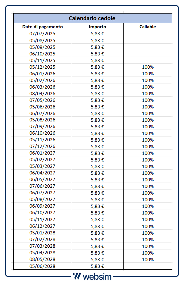 Il certificate ha una durata triennale, con scadenza fissata al 29 maggio 2028. Durante l’intero arco temporale l’investitore riceve mensilmente 5,83 euro, per un totale di 210 euro in tre anni, pari ad un flusso cedolare complessivo del 21%. Come possiamo vedere dal calendario, la prima cedola delle 36 cedole previste sarà pagata il prossimo 7 luglio 2025.