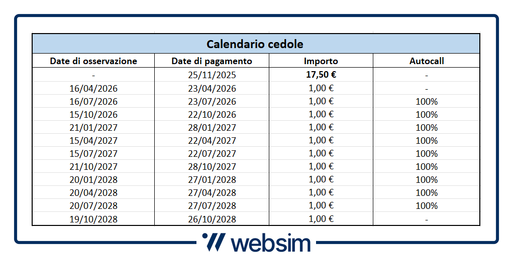 La maturity in questo caso sale a quattro anni con la scadenza che è prevista per l'ottobre 2029. Tuttavia, è possibile il richiamo anticipato con il meccanismo di autocall con trigger fisso al 100% che sarà attivo da luglio 2026.