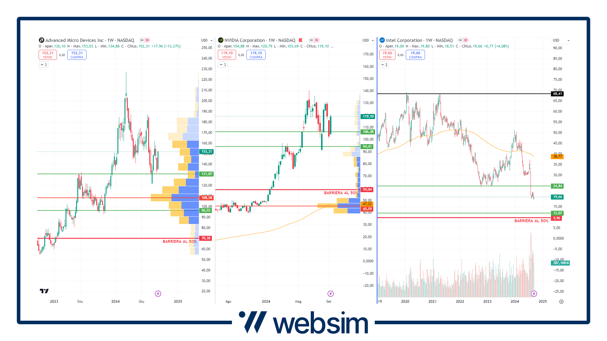 Nei tre grafici qui sotto possiamo vedere l'andamento su time frame settimanale dei tre titoli del paniere. Le linee orizzontali rosse rappresentano i livelli delle barriere premi/capitale per i tre titoli del basket.