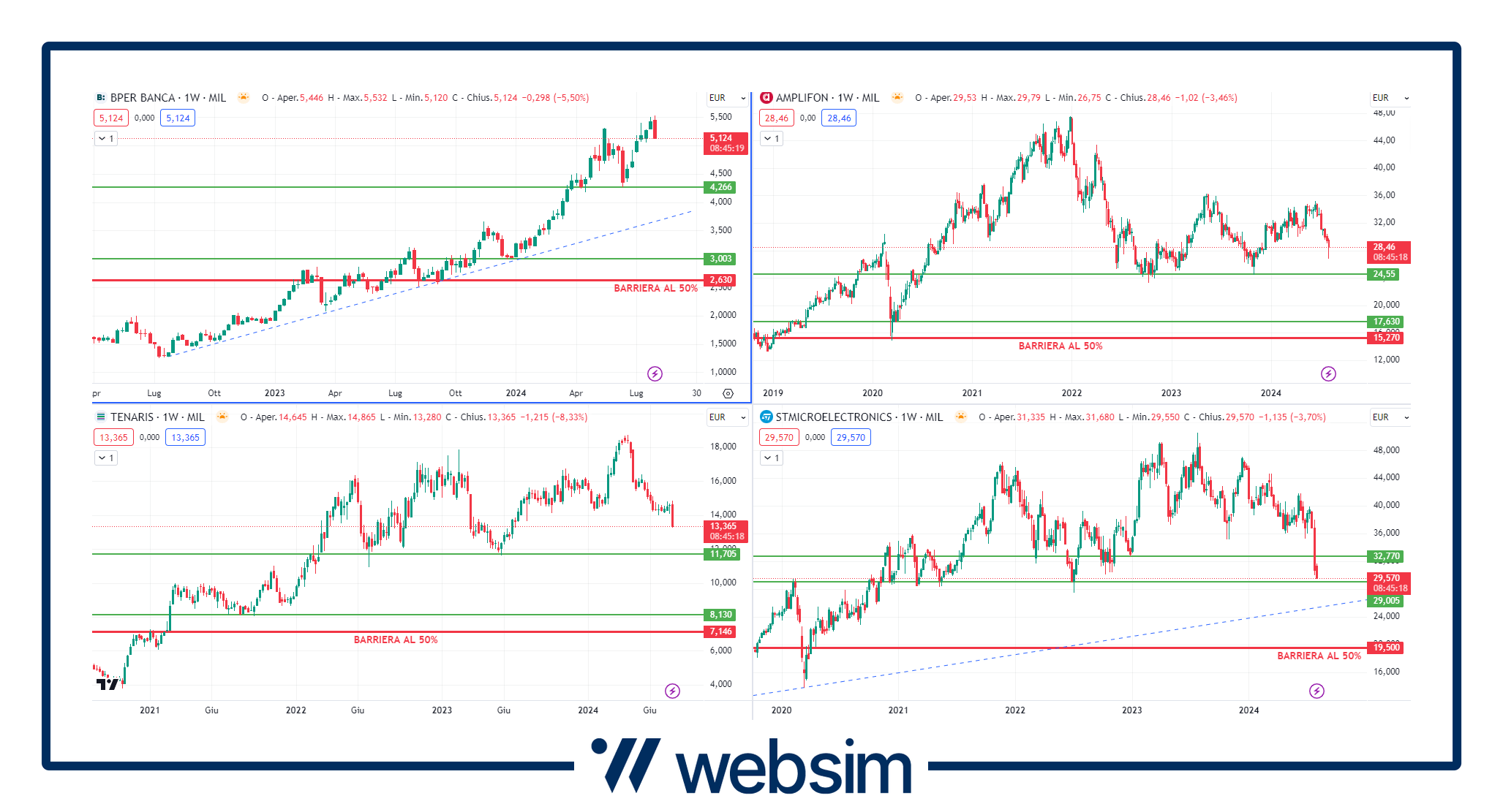 Il prodotto ha fatto strike il 10 luglio, ovvero prima delle prese di profitto viste nelle ultime due settimane. Per questo motivo tutti i quattro titoli del paniere sono ora al di sotto dei prezzi strike, ma niente paura perché ancora molto distanti dalle rispettive barriere al 50%. Ne grafici e nella tabella qui sotto possiamo vedere l'andamento dei quattro titoli, i livelli chiave di supporto e le barriere.