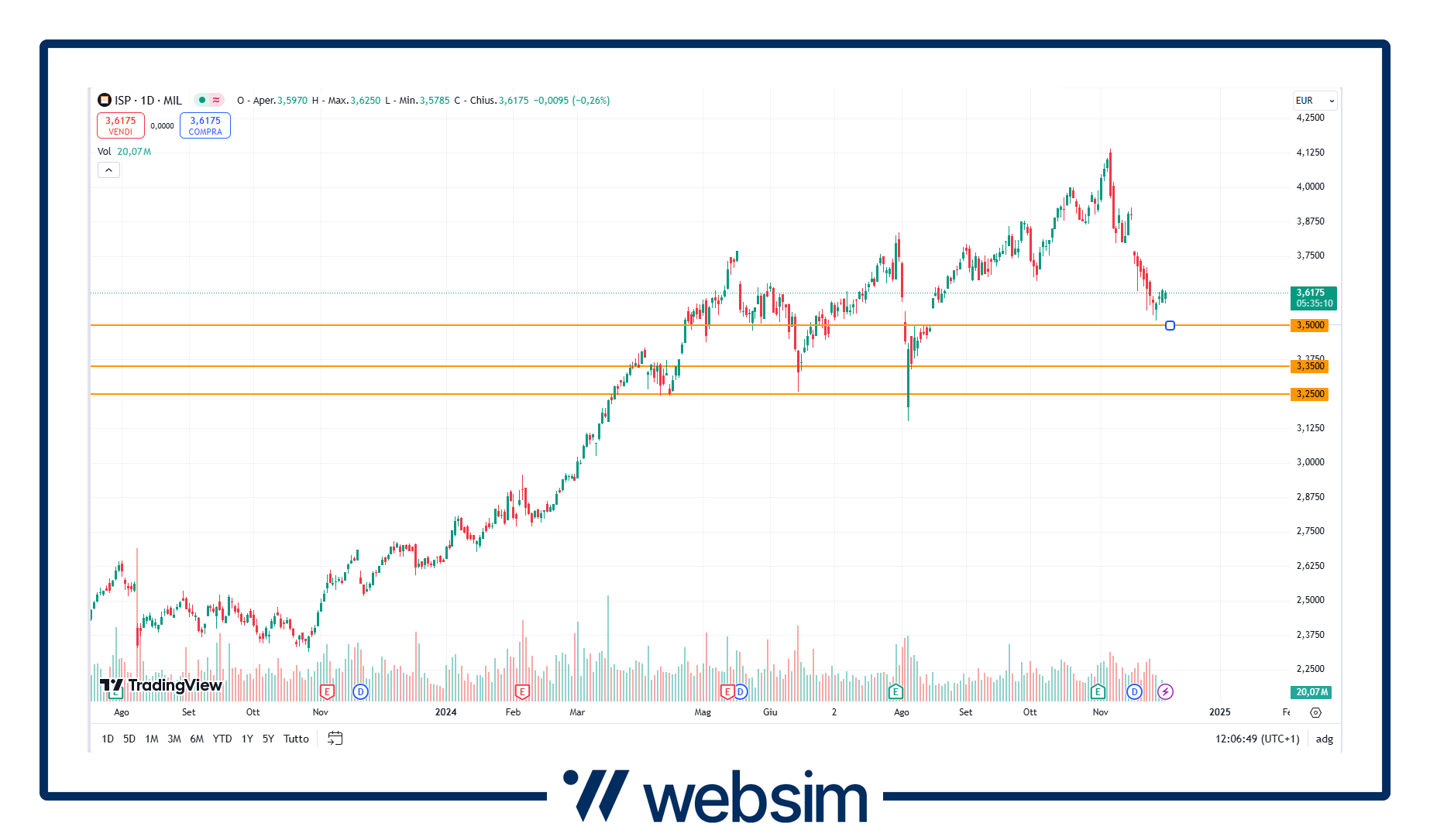Altro grande protagonista dell’anno in corso è senza dubbio Intesa Sanpaolo, che in linea con i suoi competitor di settore ha fatto registrare una brillante performance da inizio anno attestandosi a +36,40% circa. I risultati riportati dalla banca per il 3Q24 sono stati recepiti in maniera positiva dal mercato, a fronte anche di un ulteriore crescita trimestrale delle commissioni e dell’ormai consolidato posizionamento sul mercato del Wealth Management: punto chiave in vista dei futuri trend che posiziona l’istituto in uno spot più che interessante. Il titolo scambia attualmente in area 3,62 €, sostenuto da un primo supporto in area 3,50€ e, più profondi, altri due in area 3,25-3,35 €.