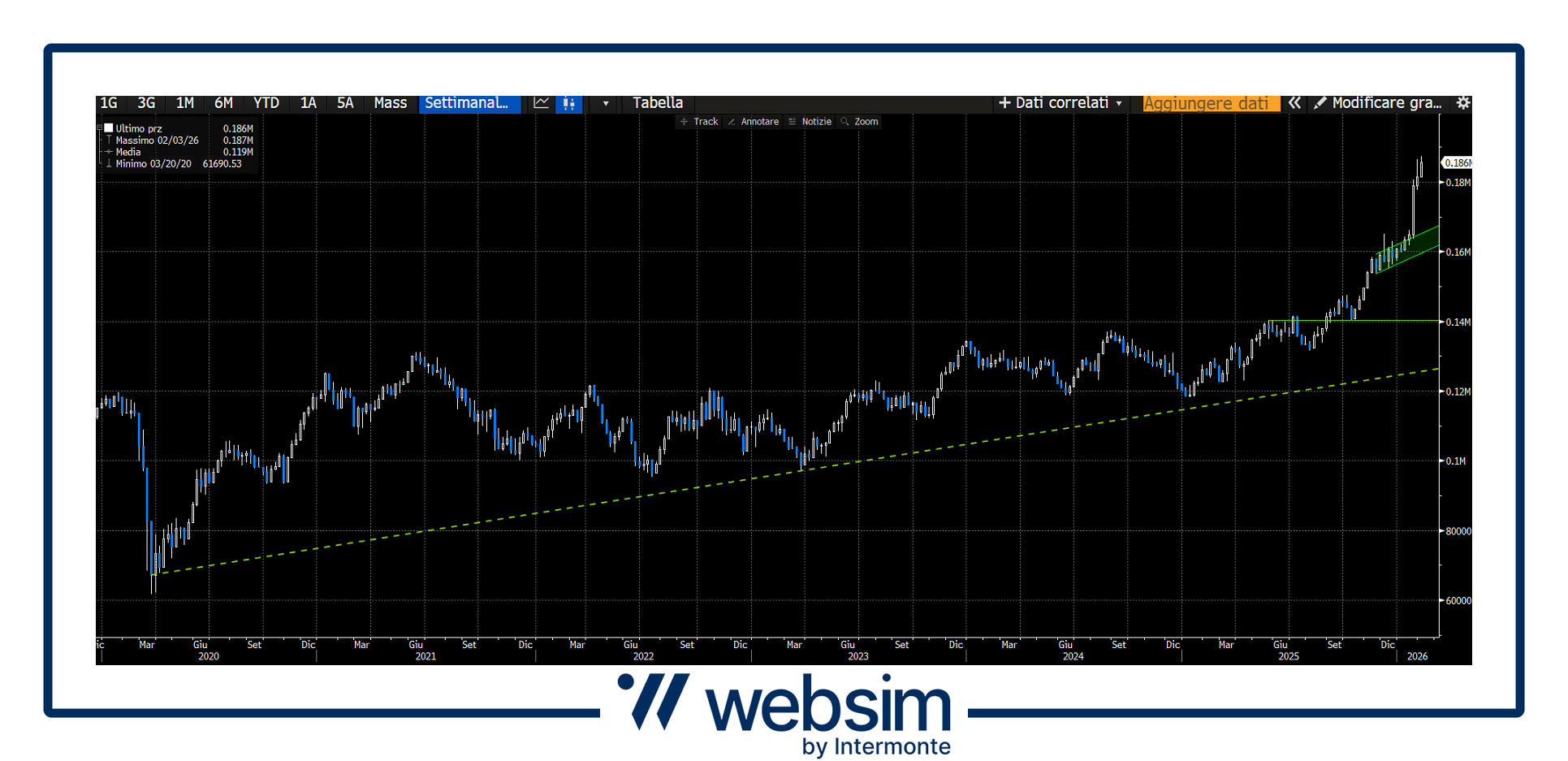 Trend primario rialzista e ben impostato dal 2020, con accelerazione nell’ultimo trimestre.